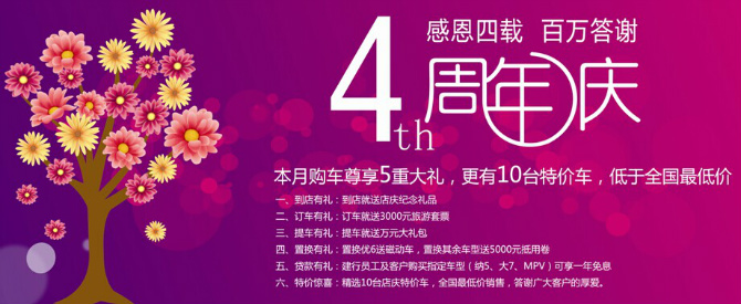 店庆购车尊享5重大礼,更有10台特价车,低于全国最低价 一、到店有礼:到店就送店庆纪念礼品 二、订单有礼:订车就送3000元旅游套票 三、提车有礼:提车就送万元大礼包 四、置换有礼:置换优6送磁动车,置换其余车型送5000元抵用卷 五、贷款有礼:建行员工及客户购车指定车型(纳5、大7、MPV)可享一年免息 六、特价惊喜:精选10台店庆特价车,全国最低价销售,答谢广大客户的厚爱。 报名电话:0513-51009555