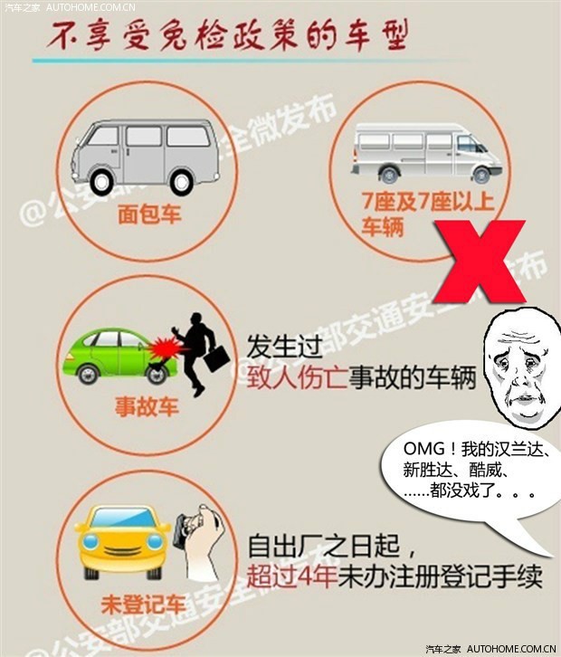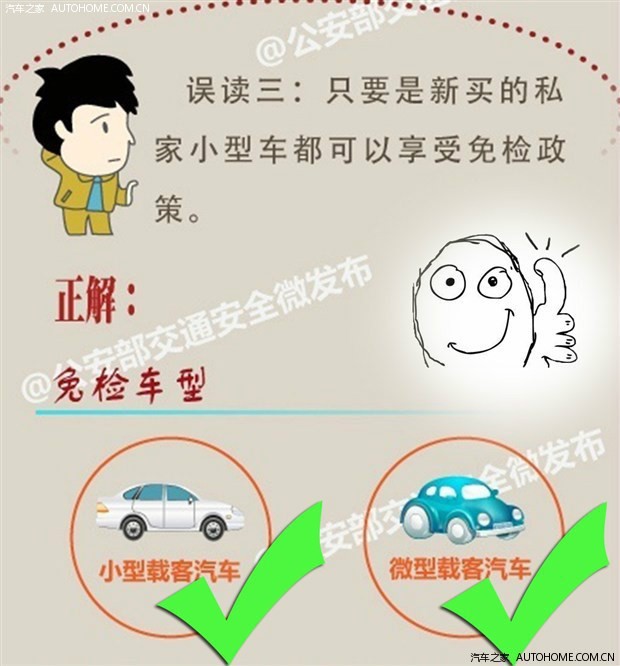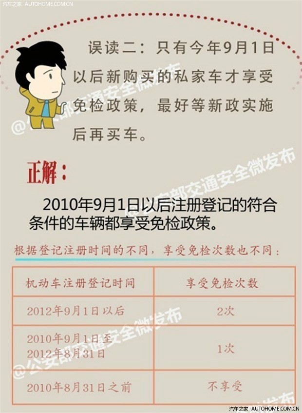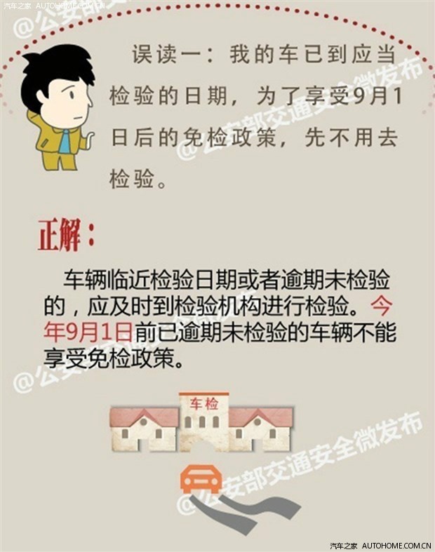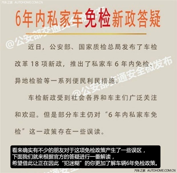 随着公安部于今年5月份颁布了新的车检政策,让广大非营运车主头疼不已的车辆年检终于有了新的转机,新政策中最大的亮点就是今年9月1日之后购买的新车将可以享受6年“免检”政策,但实际情况却是,有不少的朋友对于这项政策并不是十分清楚,而且还产生了很多误解,为此,公安部于近日发布了针对年检新政的详细解读,一起来看看详细的内容。
