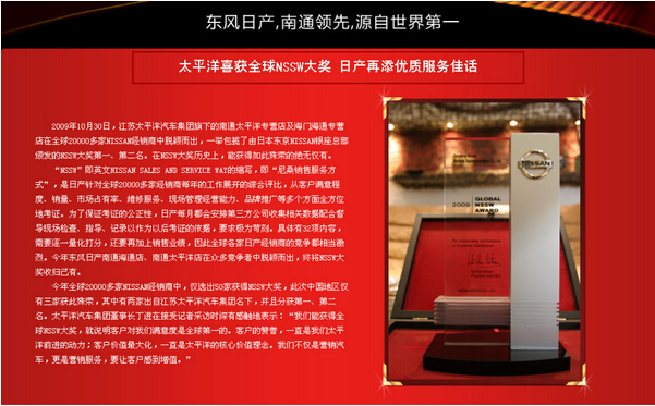 在2010年里,东风日产南通太平洋专营店在销售方面可以说是有目共睹的;在全国东风日产经销商中销售业绩也是名列前茅。另外更值得一提地是:东风日产南通太平洋专营店和海门海通专营店在2009年度还揽获NSSW全球客户满意度大奖第一、第二名。2010年底随着“全球旗舰店双星礼献 太平洋集团双龙出海”东风日产全球旗舰店——东风日产南通名尼威专营店建成。2010年度对于江苏太平洋汽车集团可以说是辛勤付出的一年、也可以说是硕果累累满载而归的一年。