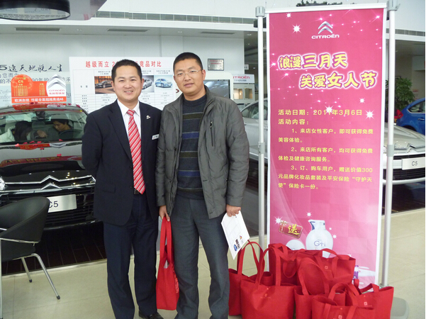 “浪漫三月天,关爱女人节”东风雪铁龙南通太平洋崇川专营店活动圆满结束,当天成交16批订单。活动当日,销售顾问以饱满的姿态迎接的来店客户,并给每位来店女性送上祝福。活动当日来店客户客户即可享受免费美容体验和健康咨询服务;订车客户除享受团购价格以外 ,还可获得我公司提供的价值300元安利美容套装 或等同价值其他安利产品,并获得守护天使保险一份。
