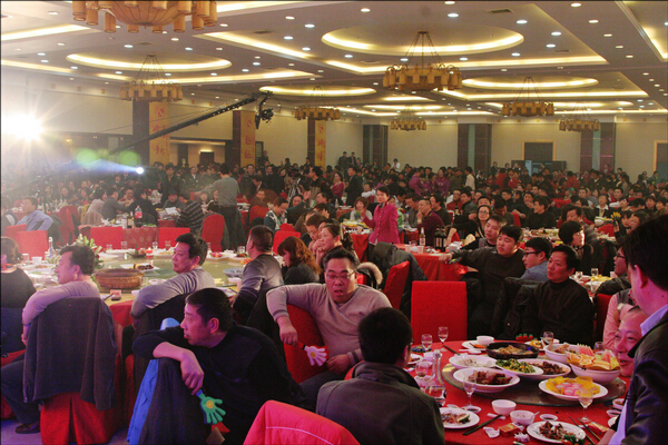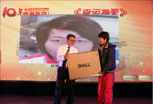 年夜饭的传统环节,员工幸运大抽奖。图为,旗下盐城专营店员工喜获大奖,丁董亲自颁奖,员工抱得大奖归。