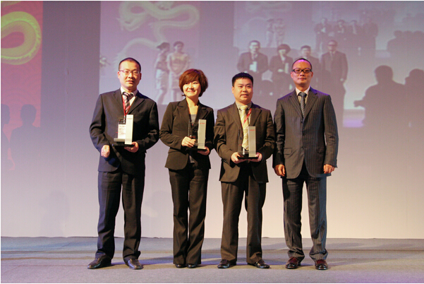 旗下海通专营店获全国客户满意度奖,杨总(右二)上台领奖
