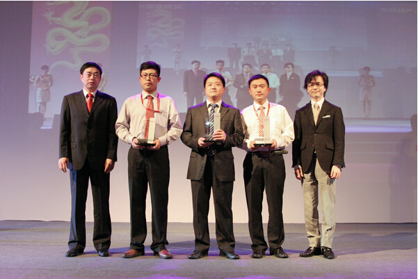 集团旗下东风日产全球旗舰店东风日产名尼威专营店获新秀专营店第一名,崔总(左一)上台领奖