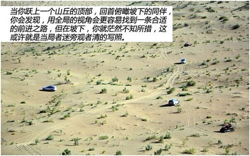 进入沙漠后,我们所遇到的困难,主要来自沙丘的通过难度。松软的沙土随时可能将车困入其中。其实,我们并不是原始拓荒者,这次行走的道路已经被试驾教练踩过点,探过路。所走的道路都是相对简单和易行的,但即便如此,我们还是数次将车辆陷入砂石之中。完成脱困是一项繁琐的事情,车队中的其它车辆需要耐心等待每一辆陷入困顿的队友,向着坡顶冲刺,多数时候都会无功而返,从头来过。这是对耐心和驾驶技术的挑战。当完成挑战之时,也会有难以言传的胜利喜悦。