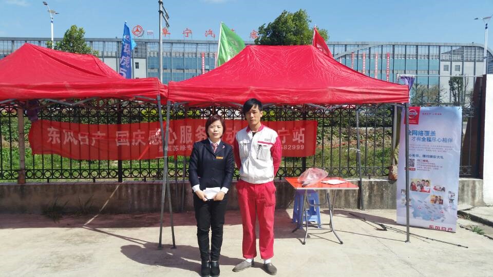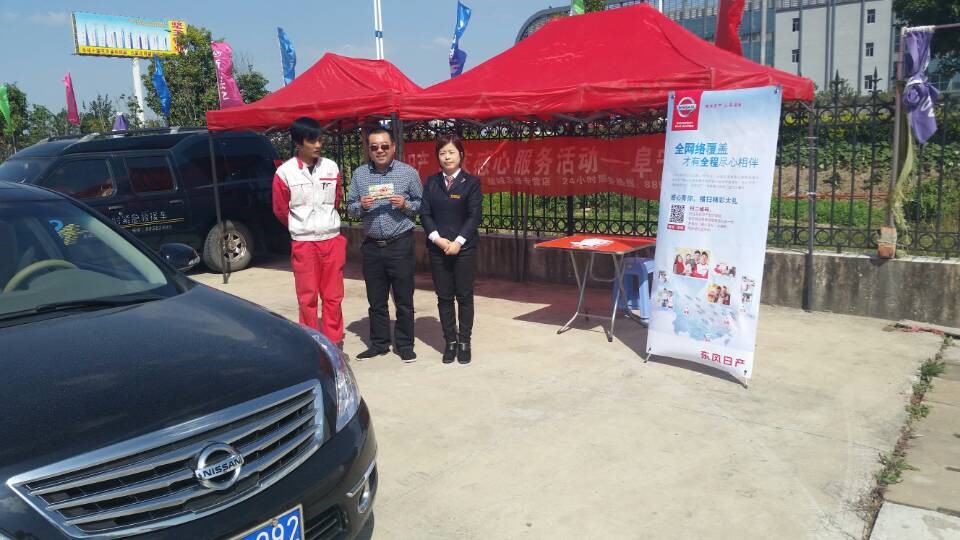 2014年10月1日-10月7日东风日产盐城苏缘店在盐城市阜宁县汽车广场设立了感心服务社区站点,为附近的东风日产车主及路过的东风日产客户提供免费车辆安检,轮胎轮辋养护及故障排除等贴心服务。