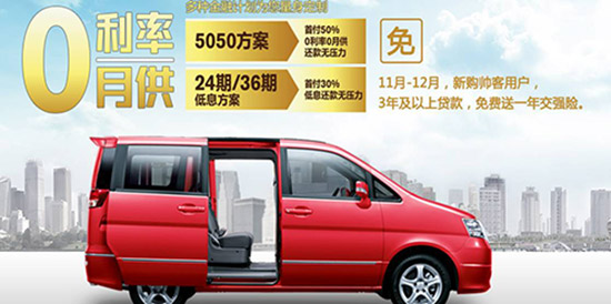 此次推出的“0利率、0月供”的“5050”和超低首付的“24期低息”以及“36期低息”这三种分期付款购车策略,主要针对帅客、NISSAN NV200、锐骐三款车。即日起,进店购车即能享受“裸价”般优惠!“5050”政策,半价就能让您提前将爱车开回家,买车时一期首付50%,1年后付清剩余的50%即可享受完全的零利率;“24期低息”和“36期低息”可用“30%起步”的超低首付,以绝对超出您期望的价格就可以轻松“贷”走爱车。另外,11月-12月,新购帅客的用户,若贷款年限达3年及以上,还将免费获赠一年交强险。