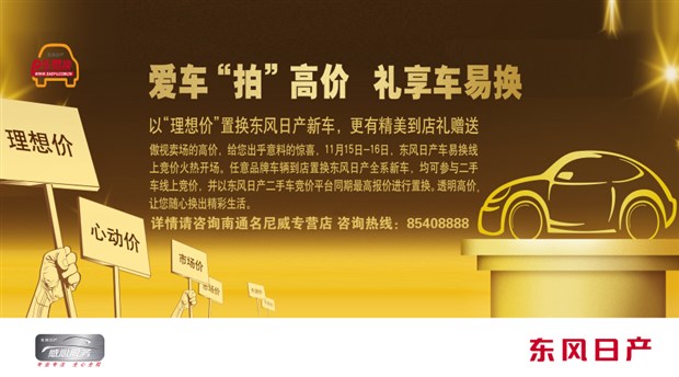 11月15-16日,南通东风日产各专营店携手大型网络平台首家推出“爱车拍高价,礼享车易换”旧车拍卖/置换大型活动!任意品牌车型到店置换东风日产全系新车,均可参与二手车线上竞价,并以东风日产二手车竞价同期最高报价进行置换,透明高价,让您随心换出精彩生活!