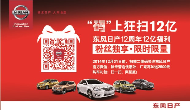 不为网购狂,争当扫码王!12月31日前,东风日产狂派粉丝福利12亿,限时限量快疯抢!到店扫码厂家即送2500元额外购车礼包!赶快约上小伙伴,一起来江苏太平洋汽车集团旗下所有东风日产专营店狂扫12亿,high翻购车季!详情请拨打:0513-85603000。