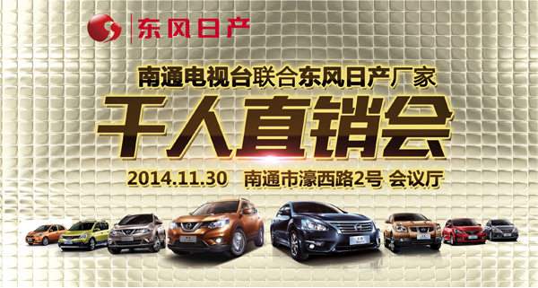 携手共进,怒放12亿!南通广播电视台联合东风日产厂家千人直销会,厂家补贴百万普惠江海大地准车主!东风日产5.98万起售,11月30日下午南通电视台会议厅准点开抢,天冷了,最佳时机拥有尼桑车,畅想暖冬!有你想不到的低价,有你没见过的场面,有你抱不动的大礼,定让你毫不犹豫,奋勇下订!不去是你的遗憾,不订是你的损失!