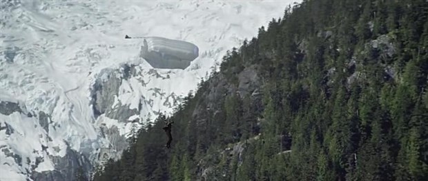 眼看小偷就要坠地,半空中突然开出一朵白色的伞花,原来小偷有备而来,竟然随身带着降落伞,绝美的山谷风光尽收小偷眼底,哪怕被个SB开着NB车死追这么久也值了。。。。(小编乱入:这货是怎么整出这么大只的降落伞的?这年头偷个东西还得自配降落伞,真是与时俱进;小偷这工种混的也不容易啊。。。。。