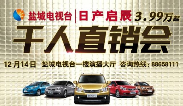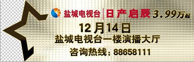 携手共进,怒放12亿!盐城广播电视台联合东风日产启辰厂家千人直销会,厂家补贴百万普惠盐阜大地准车主!启辰3.99万起售,12月14日下午盐城电视台演播大厅准点开抢,天冷了,最佳时机拥有启辰车,畅想暖冬!有你想不到的低价,有你没见过的场面,有你抱不动的大礼,定让你毫不犹豫,奋勇下订!不去是你的遗憾,不订是你的损失!