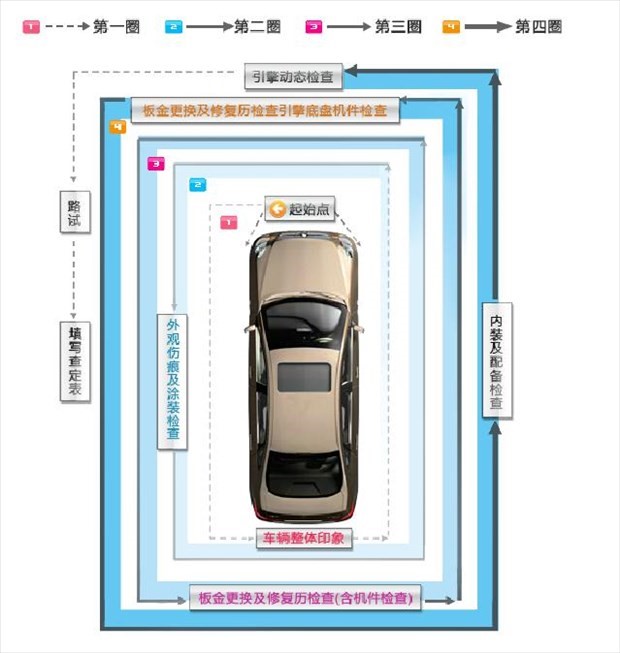 首先要将车辆开到4S店,当然也可以电话预约东风日产4S店的工作人员上面进行评估。评估师会根据东风日产二手车查定标准流程进行车辆查定,每辆车至少转四圈,大概用时20分钟,然后在评估表上进行记录(这个表是日产全球通用的)。具体查定细节,大家可以看下面的图。