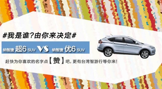 1月,纳智捷新款SUV竞猜命名活动正式启动!2月12日,东风裕隆#我是谁?由你来决定#新车命名有奖竞猜活动正式落下帷幕,东风裕隆全新时尚SUV车名正式揭晓——纳智捷 优6 SUV。