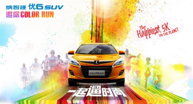 3月29日,纳智捷 优6 SUV首次领跑地球上最快乐的5公里——The Color Run!深圳、重庆、北京、沈阳、上海、广州……优6 SUV的色彩旋风席卷全国,引领了无彩跑,不时尚的流行风潮。