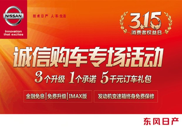 315诚信购车节, 相信日产南通太平洋,就“购”了!3月15日,东风日产南通太平洋4s店315诚信购车节发出诚信宣言:“315放心购,发动机变速箱终身免费保修,日产南通太平洋专营店真情为您服务365天”。