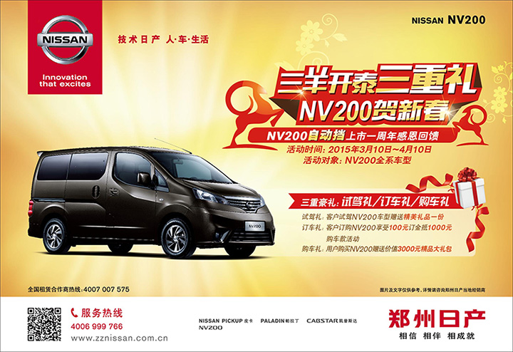 生意事业“龙抬头”, 三羊开泰三重礼 NV200贺新春,郑州日产NISSAN NV200全能王带着最真的祝福和最大的豪礼驶来!在阳春三月,一年打拼的伊始,郑州日产用好产品,大优惠,助力大家一年的事业红红火火,家庭幸福美满!