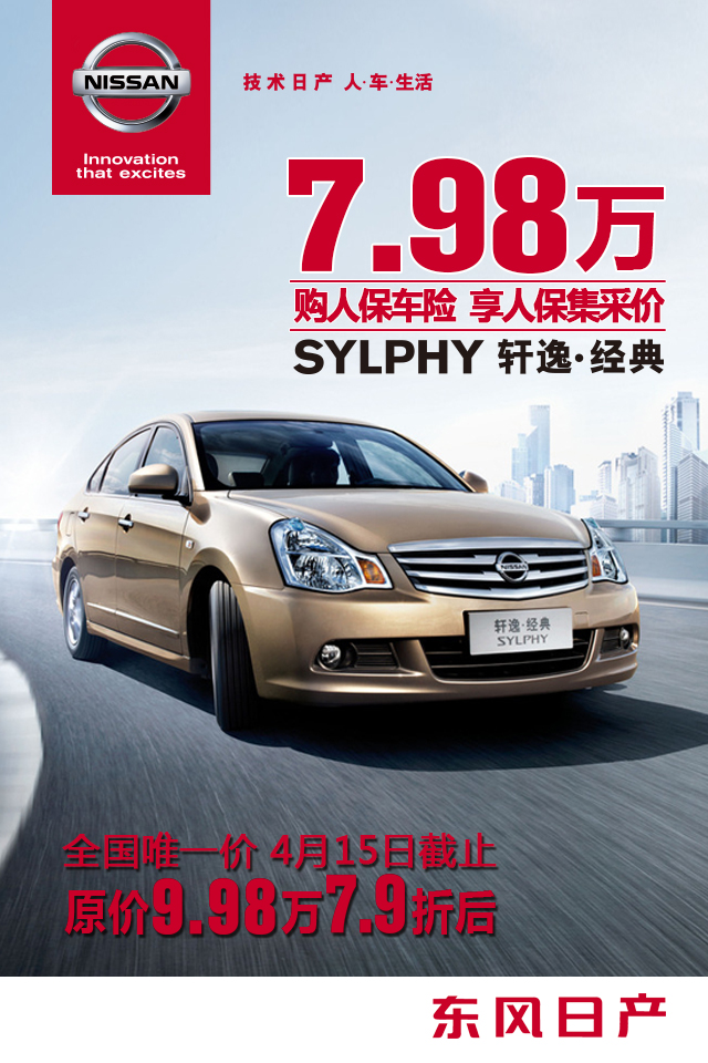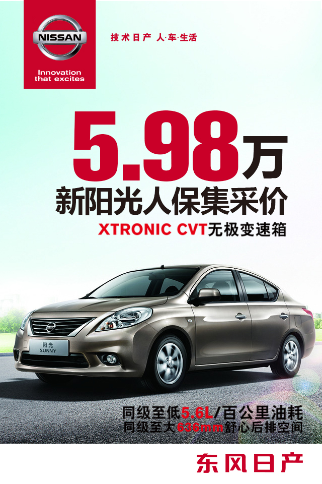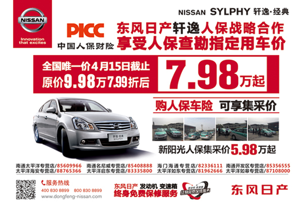 何为集采价?人保集采价就是人保财险作为东风日产的战略合作伙伴,总对总直接从厂家采购的价格,享受7.99折的特大优惠,最低7.98万起!阳光只要5.98万起哦!只要在4月15日之前完成购车,同时投保人保车险,就能享受集采价!还在等什么呢?专项福利,绝无仅有,只在我们江苏太平洋汽车集团!咨询热线:0513-85603000