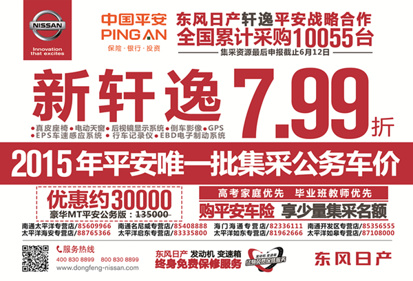 何为集采价?平安公务车集采就是平安保险作为战略合作伙伴,总对总从厂家直接采购的价格,新轩逸集采折扣为7.99折,这个价格买到新轩逸,绝对比买任何品牌的车都划算!!你只要在6月12日之前完成购车,同时投保平安车险,就能享受集采价!还在等什么呢?专项福利,绝无仅有,只在我们江苏太平洋汽车集团!咨询热线:0513-85609936