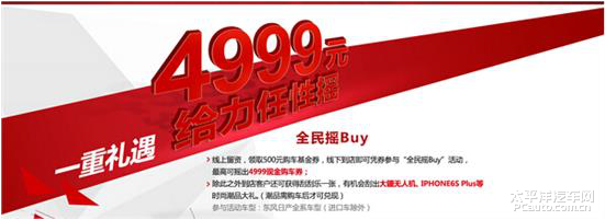 线上留资,领取500元购车基金券,线下到店即可凭券参与"全民摇Buy"活动,最高可摇出4999现金购车券,除此之外到店客户还可获得刮刮乐一张,有机会刮出大奖 无人机、iPhone 6S Plus等时尚潮品大礼(潮品需购车后才可兑现)